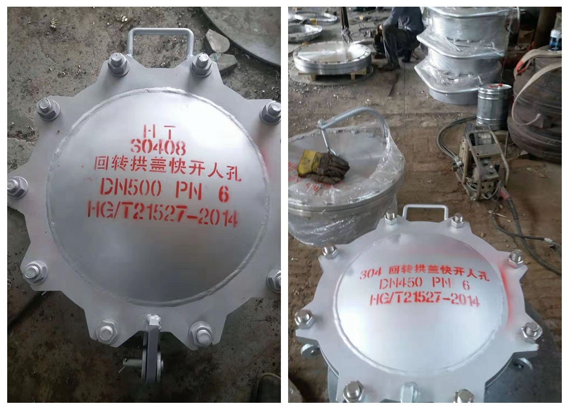 回旋蓋人孔可安裝在儲(chǔ)罐頂部和儲(chǔ)罐的側(cè)部,按圖定制?;匦w人孔是一種統(tǒng)稱,以人孔使用材質(zhì)來(lái)命名的一個(gè)常用叫法.通常安裝在儲(chǔ)罐、容器罐頂部與不銹鋼空氣呼吸閥,洗罐器配套使用,不銹鋼人孔又有起到阻火作用,是保護(hù)儲(chǔ)罐的裝置,特別適用于貯存物料以氮?dú)夥忭數(shù)墓绊敵汗蕖H丝讘?yīng)有一個(gè)設(shè)在進(jìn)出油管右側(cè)附近,并盡量使人孔正對(duì)罐室密閉門(mén),以便人員進(jìn)出、維修油罐和通風(fēng)接管用。